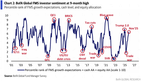 1.全球投资者情绪为2025年2月以来新高;现金比例进一步降至3.7%(vs. 10月的3.8%),或是短期股市回调信号