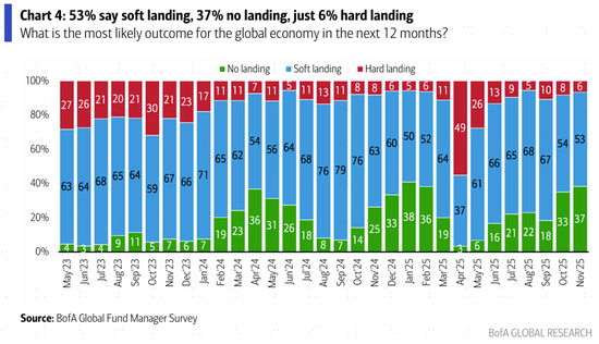 3. 45%的人认为AI泡沫是最大的尾部风险(vs. 10月的33%),其次为债券收益率的失序上升(17%);53%的投资者认为当前AI已出现泡沫,略低于10月的54%