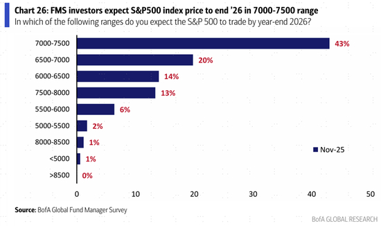 8. 43%投资者认为2026年底标普500点位在7000~7500;34%投资者认为2026年底金价在4000~4500美元/盎司