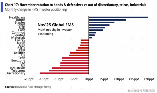 7. 11月投资者增配医疗保健、债券、必需消费、银行和美元,减配可选消费、电信、工业、英国股票和新兴市场