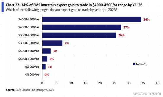 6.43%投资者认为2026年底标普500点位在7000~7500;34%投资者认为2026年底金价在4000~4500美元/盎司