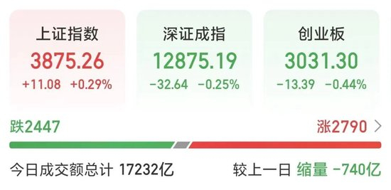 今日,A股冲高回落,三大指数涨跌不一。截至收盘,上证指数涨0.29%,深证成指跌0.25%,创业板指跌0.44%。市场全天成交额超1.72万亿元。