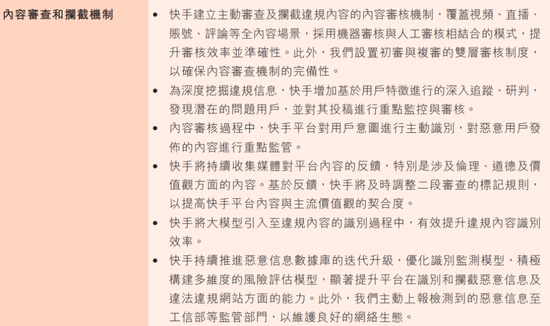 其于2025年4月发布的《2024年度环境、社会及管治报告》明确指出,在内容审查和拦截机制方面,快手采用机器审核与人工审核相结合的模式,提升审核效率与准确性;快手持续推进恶意信息数据库的迭代升级,显著提升平台在识别和拦截恶意信息及违法违规网站方面的能力等。