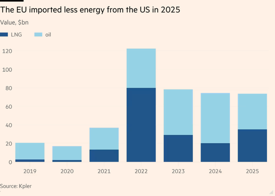 欧盟委员会称,2025年前11个月已采购约2000亿欧元(2360亿美元)美国能源产品,其中油气进口量增加(尤其是美国液化天然气),并预计2025年美国液化天然气进口量将从去年的450亿立方米增至700亿立方米。