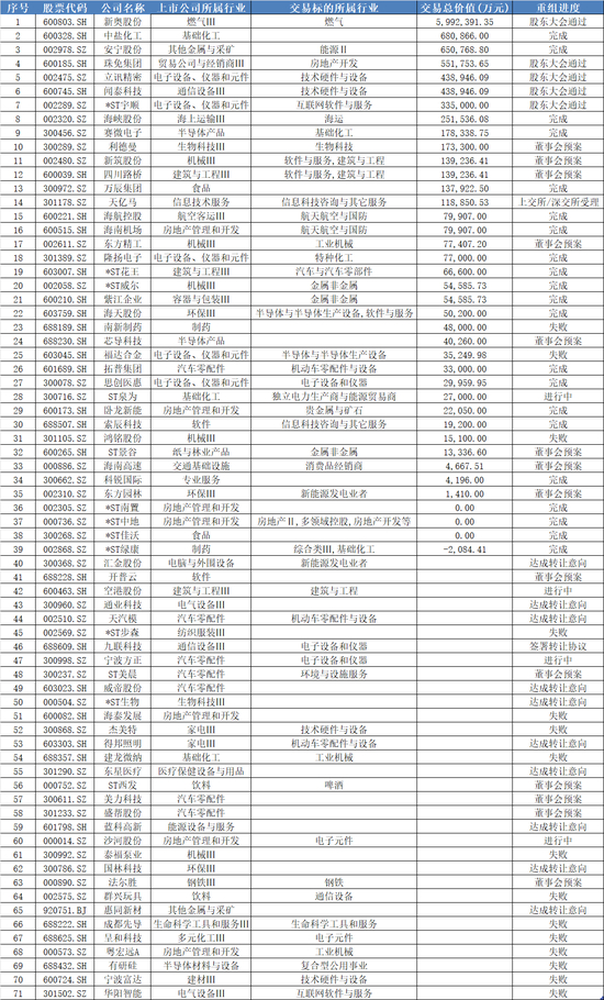 据界面新闻记者按首次披露日期不完全统计,自年初至今,A股上市公司共计披露并购重组事件数量达2377条,去年同期为2754条;重大重组事件数量达71条,去年同期为52条。
