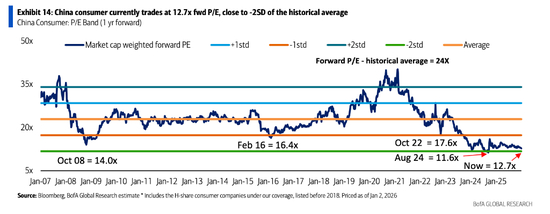 目前,消费板块12.7倍的前瞻市盈率已接近其历史均值下方两个标准差的极端低位,进入深度低估区间,并开始吸引部分逆向投资者的关注。美银指出,近期客户问询中涉及中国消费股的话题明显增加,反映出市场对该板块的关注度正逐步回升。