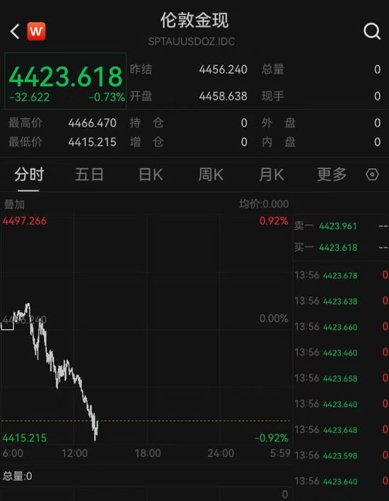 另外,今日黄金小幅下跌,截至发稿,现货黄金报4423.618美元/盎司。