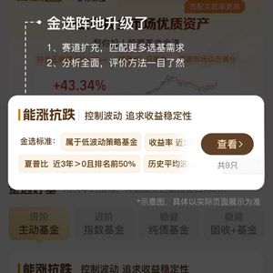 记者注意到,近期,蚂蚁基金“金选”在主动基金中新增“能涨抗跌”赛道,重点关注基金的波动类指标并在页面直观呈现,包括历史平均波动率、最大回撤等。目前,基金排行榜已形成“能涨抗跌”“跌后恢复快”“连续多年跑赢指数”等围绕用户视角的长期、多维度指标。