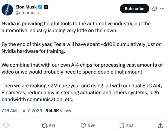 在CES展当天的媒体采访环节,黄仁勋谈到特斯拉FSD时依然是一通乱吹,“世界级标杆”、“表现完美”、“我自己都在用”赞美三连[2]。可惜马斯克并不领情,回应完自己睡眠质量的担忧后再次开炮,一边大夸特夸特斯拉的技术水平,一边嘲讽汽车行业: