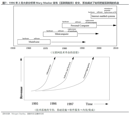 1996年2月摩根斯坦利分析师Mary Meeker发表300多页的《互联网趋势》报告,成为当时华尔街最有影响力的互联网投资指南:1)把互联网趋势和之前“个人电脑革命”类比;2)提出了从基础设施/硬件→软件服务→内容/集成的落地和投资思路。