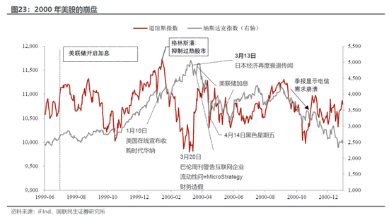 打响第一枪的还是美联储。2000年1月13日格林斯潘在纽约经济俱乐部发表讲话(1月14日刊发),转向旗帜鲜明的抑制“股市过热”,核心的逻辑是股市上涨的财富效应会带来需求激增、威胁通胀稳定。同日,道琼斯指数触顶。随后美联储在2月、3月和5月连续加息。
