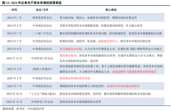 2025年3月《政府工作报告》提出“加强战略性力量储备和稳市机制建设”;2025年4月中央政治局会议提出“持续稳定和活跃资本市场”,体现从“稳”到“活”的深化;2025年7月中央政治局会议进一步要求“巩固资本市场回稳向好势头”,标志着政策目标从“稳定”向“巩固提质”的递进升级。