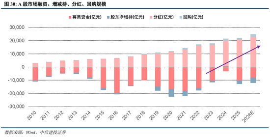 • 展望2026年,在企业融资常态回暖的趋势下,预计全市场融资规模有序恢复至8000亿元左右;随着市场修复上涨,减持规模可能放大至4000亿左右,但在多方面监管限制下,合规减持对市场的实质影响相对有限;在各方面政策鼓励和央国企的带头作用下,A股分红回购规模有望进一步增长,以近5年复合增速来推算,预计2026年分红回购规模有望达到2.5万亿元;整体来看,2026年市场有望维持万亿级别的资金盈余。