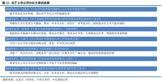 A股整体资金生态正在发生改观,股东回报是大势所趋,通过分红增强投资者信心,并且吸引中长期资金入市。2023年以来,监管政策逐步构建起“强制披露+约束惩戒”的分红监管框架,形成“基础制度+专项指引+市场激励”的分红引导体系,核心方向为强化分红监管硬约束、鼓励现金分红与比例提升。与此同时,政策明确引导上市公司增加分红频次、优化分红节奏,推动中期分红、季度分红常态化,并将分红作为央企市值管理与业绩考核的核心指标。