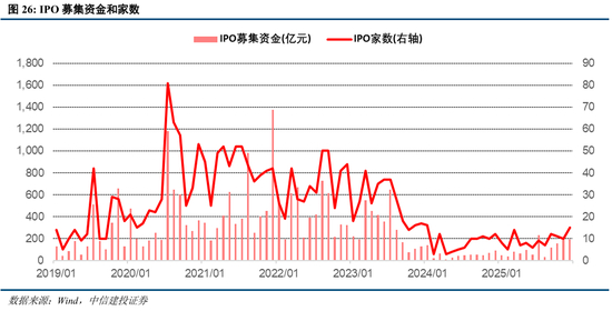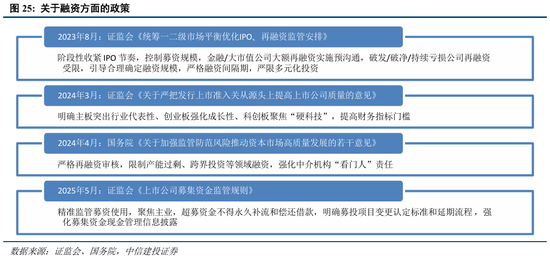 融资方面统筹平衡,量减质升,结构优化。2023年以来,监管层多次提及“健全投资和融资相协调的资本市场功能”,以统筹一二级市场平衡为核心,围绕IPO与再融资构建“精准调控、结构优化”政策体系,阶段性收紧IPO节奏,同时优化融资结构,形成“严把入口关、支持科技创新、强化质量监管”的总体导向,实现了资源向优质企业集聚的效果。2020-2022年间,A股每年IPO规模约5000亿元上下;2023-2025年,A股IPO募资从3600亿元左右降至660亿元后反弹至1300亿元左右,资金向半导体、电子设备等科创领域集中,政策引导资本市场服务实体经济与科技创新的作用显著。