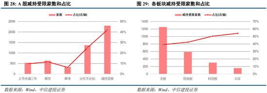 截至2025年底,全A共有2300家上市公司减持受限,占比达到42%,其中分红条件不达标的公司较多,占比达到25%;分板块来看,主板和创业板减持受限公司占比40%左右,科创板和北证占比超过50%。
