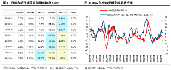 2026年处于全球降息周期下半场,宏观流动性呈现“内外宽松共振”与“从超常到常态”两大核心特征。全球层面,美联储预计延续降息50BP的节奏,2025年12月重启扩表缓解美元融资压力,叠加全球通胀降温,各国央行宽松政策得以维持。国内方面,货币政策从“超常规逆周期调节”转向“加大逆周期和跨周期调节力度”,以稳增长、促物价回升为目标,通过多元工具保持流动性充裕,支持内需、科创等重点领域。