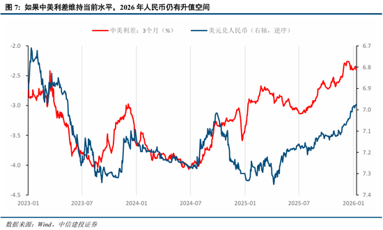 2026年,在美联储继续降息、美国财政状况持续恶化的背景下,美元或将维持弱势表现,与此同时,由于政策引导、出口强劲和资本流入,人民币有望继续升值。从短期来看,人民币汇率的走强可以理解为一种补涨,以中美3个月期国债收益率利差作为参考,如果这一利差维持当前水平,人民币汇率有望从当前7.0升值到6.8的水平。考虑到未来美联储进一步降息的可能,我们认为人民币2026年仍有进一步升值空间。