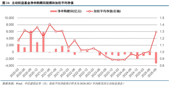 此前2020-2021年间大规模新发的主动权益基金的浮亏,成为阻碍普通个人投资者资金入市的隐形压力之一。2023年二季度,这批基金的加权平均净值回落至1附近,自此投资者便开启了持续净赎回的模式。到2025年三季度,这批基金的加权平均净值回升至1.3附近,当季度全市场主动权益基金加速赎回超过3000亿元。