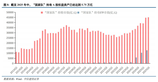 “国家队”的权益资产配置可从两个角度进行统计,一个是直接持股(统计口径:中国证金、中央汇金、中国证金资管、社保基金等),一个是持有ETF(统计口径:中央汇金投资、中央汇金资管)。2023年以来,“国家队”持有A股权益资产市值大幅上升,截至2025年中,“国家队”持有的权益资产规模(包括股票和ETF)已经达到5.75万亿,较2022年年底增长112%,成为一股不可忽视的A股市场参与力量。