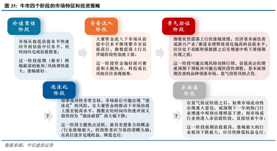 不同牛市阶段增量资金扮演的角色不同,市场行情特征也有较大差异。在2026年年度策略展望《慢牛新征程:博弈当下,布局未来》中,我们指出按照各阶段指数上涨的核心驱动力:来自风险偏好/流动性或基本面进行划分,可以将一轮典型的牛市划分为“价值重估→资金流入→景气验证→泡沫化”四个阶段。其中,前两个阶段均表现为估值拔升和资金流入,市场特征较为接近;第三阶段基本面改善成为市场核心动力;第四阶段估值为市场焦点,三因素共同作用下进入“泡沫化”或直接“杀估值”阶段。