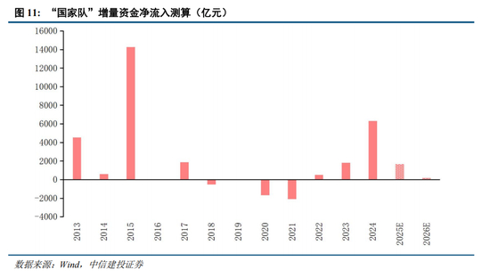 不过,由于资金主体和配置目标的不同,“国家队”增量资金流入规律和其它资金类型有着较大差别,我们根据“国家队”持有A股和ETF的情况,估算出历年“国家队”增量资金净流入情况,几个重要的特征如下: