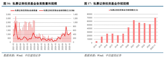 2025年A股市场成交热度明显升温,市场风格从大盘价值转向小盘成长,背后的主要驱动力量之一在于以两融和私募为代表的高风偏资金。2025年6-12月期间,两融资金净流入超过7000亿元,成交额占比从9%左右攀升一度接近12%,成为推动市场向上运行的重要力量之一。私募基金也表现活跃,2024年月均备案规模约120亿元,2025上半年提升至300亿元,下半年则接近500亿元,截至2025年11月私募证券投资基金存续规模超过7万亿元。