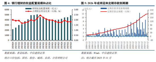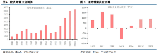 因此,对险资和理财A股增量资金测算结果预计2026年这两项中长期资金约为9340亿,这一基准假设下,2026年新增保费收入6.6万亿(+7%),险资运用余额增长6万亿,理财产品规模新增4万亿。保费和理财产品体量增长在10-11万亿之间。这与2026年全年约45万亿的定期存款到期规模还有较大差距,因此我们的基准假设实际上偏保守,考虑到定期存款到期后对更高回报率的储蓄险和理财产品配置需求,流入A股的中长期资金还会更多。