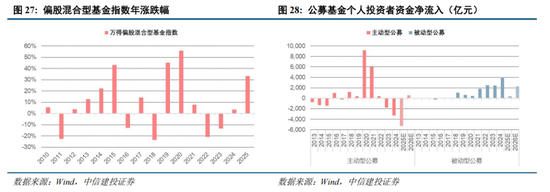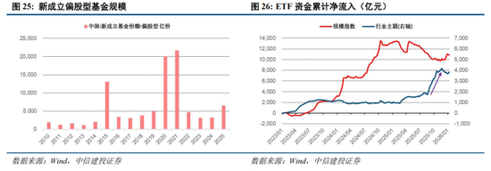 我们判断基金赎回压力最大的时刻已经过去,亏损基金净值修复叠加市场赚钱效应,个人投资者重新入市的动力正在增强。2025年新成立偏股型基金规模超过6500亿元,相较2023-2024年实现翻倍;2025年8-11月期间,个人投资者参与较多的行业主题型ETF,出现接近2500亿元的资金净流入;与此同时市场赚钱效应也正在积累,2025年偏股混合型基金平均涨幅达到33.2%。