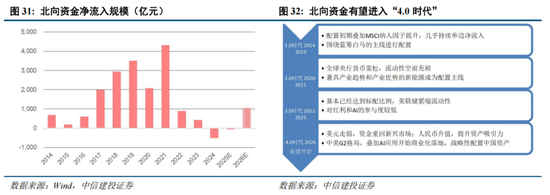 随着中美两国博弈全面深化,尤其是加强在科技领域、未来产业以及关键资源品方面的竞争,未来全球“G2”的两极格局愈发明晰;叠加AI产业开始进入应用商业化落地阶段,中国企业可能展现出更多优势,全球资金有望战略性配置中国资产。流动性有利环境叠加产业优势,北向资金流入有望复刻“2.0时代”情形,但考虑到当前A股估值已经有所提升,预计2026年北向资金净流入额为2020年的一半,约1000亿元左右。