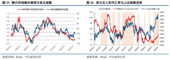 美元弱周期,新兴市场有望受益。从海外资金全球配置的角度来看,美元走弱不但直接降低美元资产的投资吸引力,并且背后往往还蕴含美国经济走弱等基本面不利因素,导致全球资金从发达市场向新兴市场切换。历史数据显示,美元弱势周期往往伴随新兴市场资金流入与资产价格上涨。
