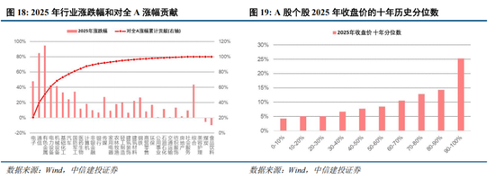 2025年A股市场指数涨幅显著,但行情结构性特征突出,赚钱效应并未充分铺开。2025年有色和通信行业涨幅超过80%,加上电子和电力设备行业,前4大行业对A股的涨幅贡献超过60%。截至2025年底,上证指数几乎位于十年新高,而股价在十年90%以上分位数的个股仅有25%。另一方面,上交所开户数处于历史均值水平,即使在私募基金内部,占绝大多数的主观股票多头策略产品仅取得20%左右的收益水平,而量化多头策略产品数量占比仅10%左右,平均回报则超过40%。