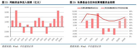私募基金方面,假设2026年存续规模增长至8.5万亿元,股票仓位提升至70%,剔除股价上涨因素后增量资金有望达到7000亿元左右。
