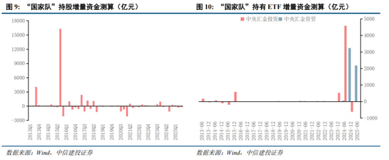 “国家队”增量资金流入方式已经出现巨大变化,ETF成为主流:2024年以来“国家队”直接持股虽然市值大涨,但资金呈现小规模净流出态势,ETF成为主要资金流入配置渠道,且近年来并未出现ETF净卖出的情况。2024年下半年以来ETF的配置由中央汇金投资转向中央汇金资管,截至2025年年中分别持有ETF市值6677亿元和6123亿元。品种主要有沪深300ETF、上证50 ETF、中证500 ETF、创业板ETF、中证1000ETF、上证180ETF、科创板50ETF等。值得注意的是截至2025年年中,中证A500ETF尚未进入汇金的ETF持仓名单中。