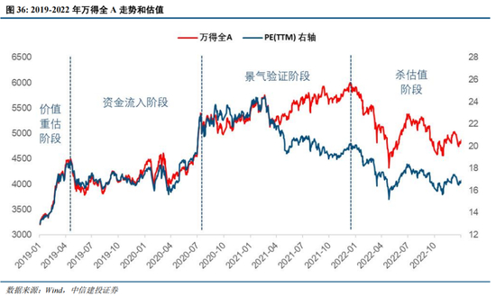 2019-2022年牛市行情和转熊过程:疫情冲击之下,2020年二季度开始的全球性货币宽松推动全球股市大幅上涨,A股也获得大量资金涌入,上证综指一度突破3400点,市场对于政策支持下基本面修复和市场表现信心十足。2021年初公募基金“抱团”有所松动,市场也逐步进入景气验证阶段,从基本面修复带来的顺周期行情,到消费白马股“剩者为王”行情,再到新能源板块业绩预期持续上修股价大涨。景气验证阶段中市场整体估值水平震荡下行,逐步消化,而市场在整体上涨的趋势中已经出现了多次行业风格切换,也是结构性行情特征最突出的阶段。最后由于2022年初美联储加息引起市场流动性出现大幅恶化,牛市结束,进入“杀估值”行情。