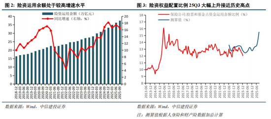 保险公司因此不得不面对“资产荒”,2020Q1至2025Q3,保险资金运用余额由19.4万亿元扩大到37.5万亿元;同期“股票和证券投资基金”余额从2.49万亿元增至5.59万亿元,权益配置占比保持在12%–14%区间波动,2025年Q3大幅攀升到15.5%(注:该数据为根据人身险和财产险数据加总计算得到的测算值),接近2015年5月16.1%的历史高位。