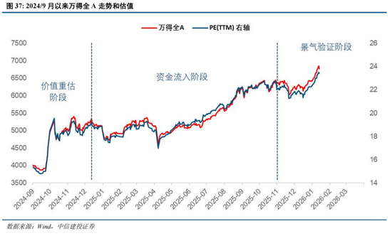 正如我们前文所述,今年一季度很可能是全年增量资金最为充裕的时间段,叠加“跨年行情”/“春季躁动”的季节效应,市场近期在增量资金和高风险偏好推动下再次开启了“拔估值”行情。我们认为,市场仍未脱离牛市“景气验证期”,“拔估值”行情只是季节效应下的阶段性行情。随着万得全A市盈率(TTM)接近24倍历史高位,投资者对景气验证的要求将会提升,市场板块风格轮动或将加剧,全A指数则将重回慢牛震荡之中。