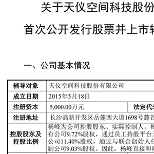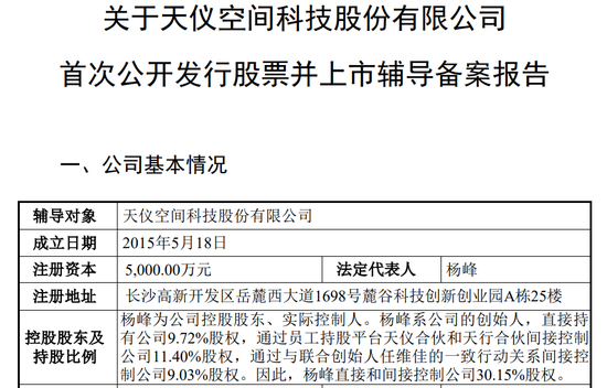 辅导报告显示,天仪空间成立于2015年5月18日,注册资本为5000万元,控股股东和实际控制人均是杨峰,合计控制30.15%的股份。