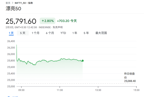 受益于美国降低印度的关税,印度股市盘初暴涨5%,随后回落至3%左右。