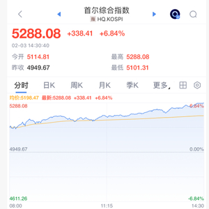 韩国股市昨日一度暴跌熔断,今天暴涨近7%,完全收复了昨日的跌幅。
