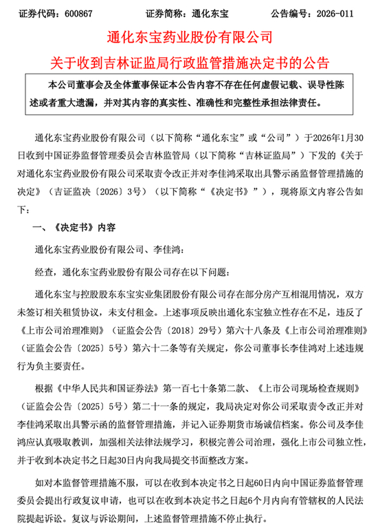 2026年1月30日,通化东宝药业股份有限公司(简称“通化东宝”,600867.SH)发布公告称,收到吉林证监局下发的行政监管措施决定书。决定书指出,通化东宝与控股股东东宝实业集团股份有限公司存在部分房产互相混用情况,双方未签订相关租赁协议,也未支付租金。
