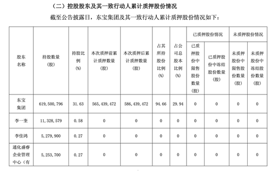 截至2026年1月30日,东宝集团合计持有6.2亿股公司股份,累计质押5.86亿股,占公司总股本的29.94%,占该股东持股数的94.66%。如此高比例的股权质押,反映出控股股东自身的资金压力,也可能对公司稳定性带来潜在影响。