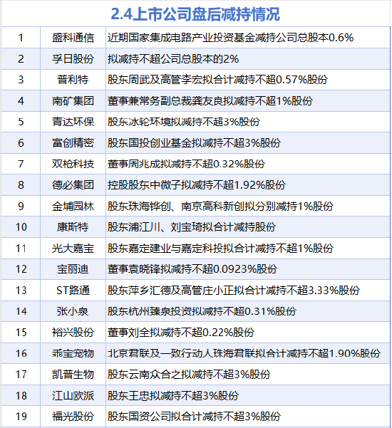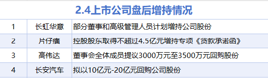 2月4日增减持汇总:长安汽车等4股增持 盛科通信等19股减持(表)