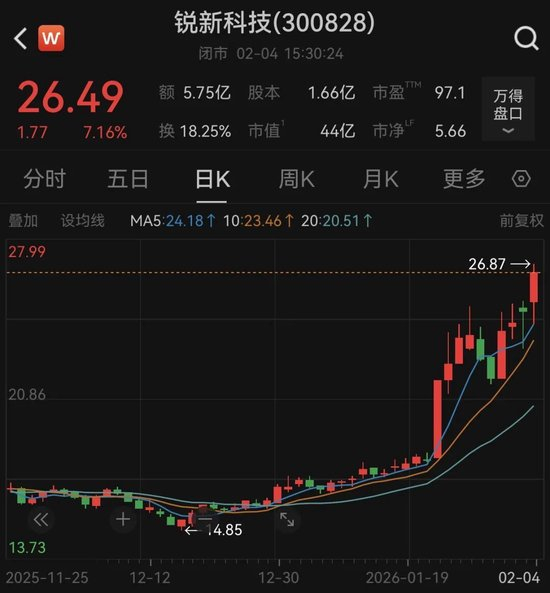 Wind数据显示,2月4日,锐新科技股价涨幅为7.16%,最新市值为44亿元。
