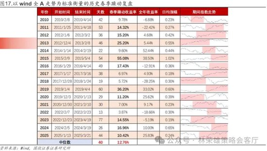 第五,基于我们对历史行情的分析,春季躁动有3个特点:1、启动集中在12月-2月份;2、政策变化和经济预期的变化是最常见的催化剂;3、平均期间收益率在10-15%。“春季躁动”在过去 16 年中几乎从未缺席,展现了极强的季节性规律。历史上,这波行情的平均持续时间约为40天左右,Wind全A的涨幅中位数是12.76%。