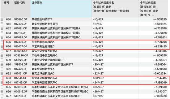 我拉了下Wind数据,同类产品里,华宝有华宝纳斯达克精选、华宝海外新能源汽车两只基金今年以来的表现垫底。