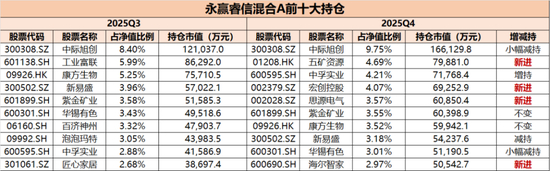 2025年四季度,永赢睿信混合A的前十大有4只新进,分别为五矿资源、宏创股份、思源电气和海尔智家。