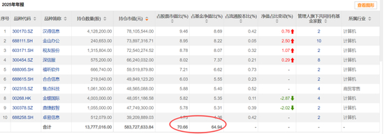 2025年年末前十大重仓股几乎全部来自于计算机板块,涵盖办公软件金山办公、税务软件税友股份、PDF软件福昕软件、工业软件鼎捷数智、网络安全深信服等。