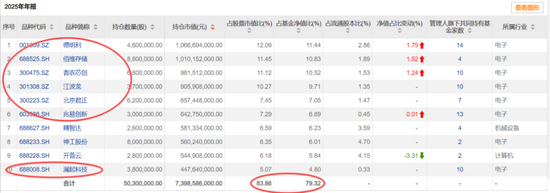 受存储涨价、业绩落地等利好刺激,股价持续上攻的德明利、佰维存储、江波龙、香农芯创、北京君正、兆易创新、澜起科技均出现在前十大,且占比很高。