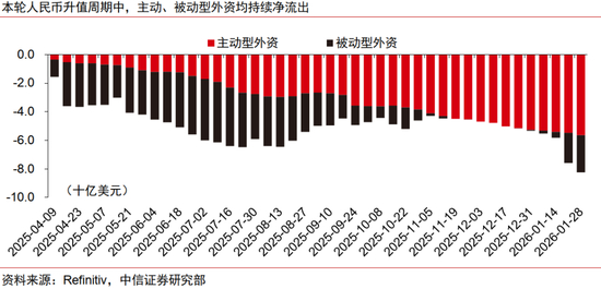 我们认为,开始于2025年二季度的本轮人民币升值周期,并不同于历史上任何一轮人民币升值。与过往7轮人民币升值周期相比,本轮升值出现了一些与众不同的迹象:港股的表现并不突出,市场对中美经济“东升西落”的预期并不高,外资持续流出A股市场,美元指数的阶段性强势无法改变人民币升值趋势。从历史经验来看,上述迹象同时出现时,很难与人民币持续升值相联系。这些迹象也表明,本轮升值周期的推动因素与配置思路与历史经验存在差异,根据经验进行简单外推的有效性可能较差。